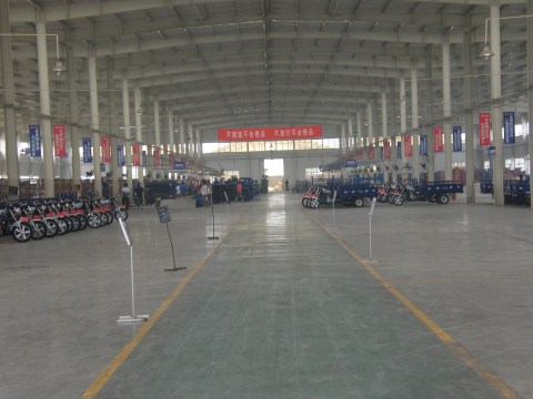 Hall van een fabriek voor gemotoriseerde triporteurs nabij Luoyang. Bij de ontvangst hadden niet alleen de directeurs een prominente plaats...