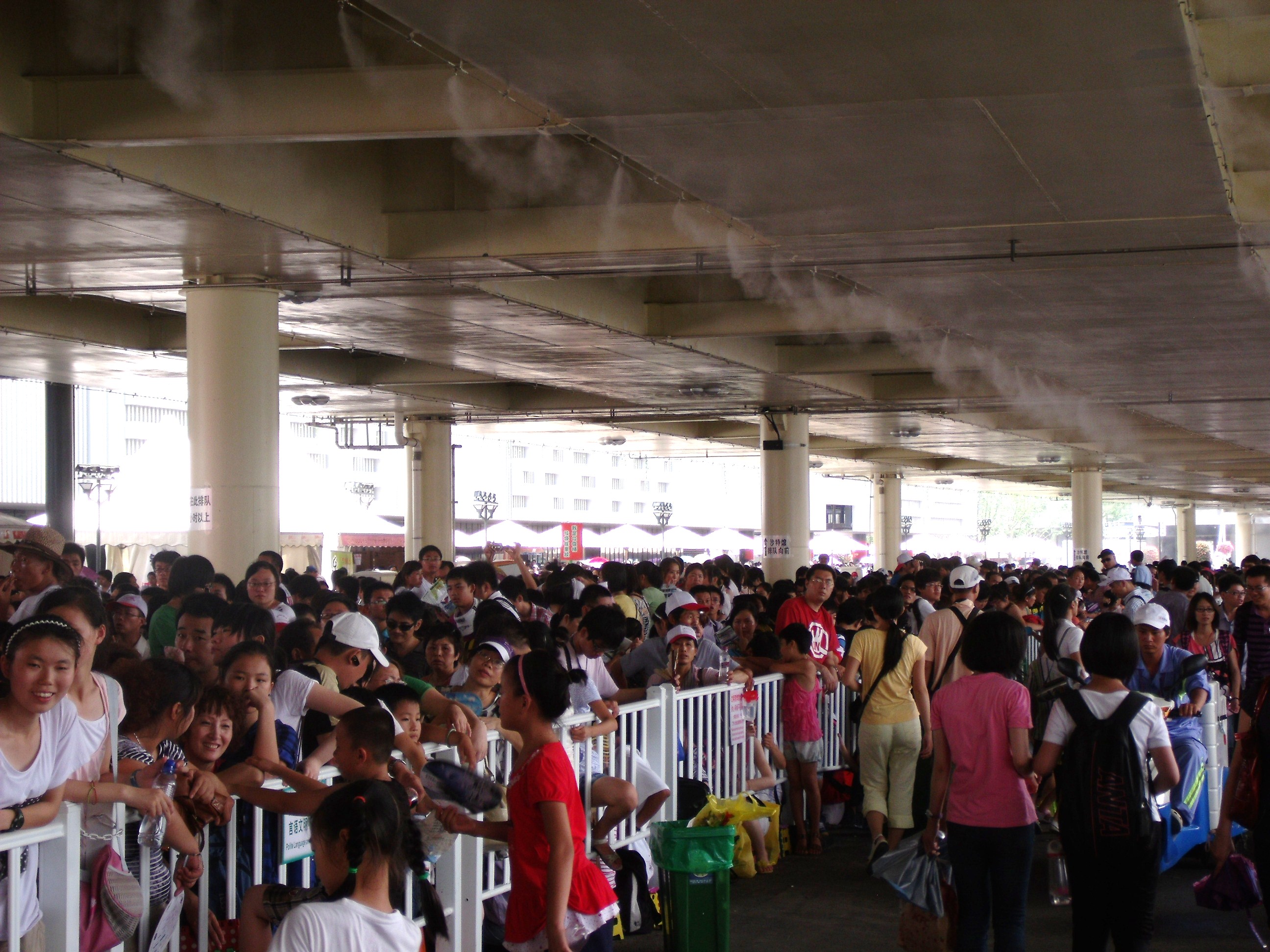 Voor de drukst bezochte paviljoenen tot 6 uur aanschuiven in de hitte, onder luifels en waterverneveling.