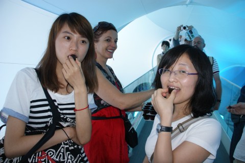Ook onze studentinnen-gidsen Ren en Xu, hier op de trap in 'de zenuwcel' van het Belgisch paviljoen, lusten onze pralines. Foto Olivia Snykers.