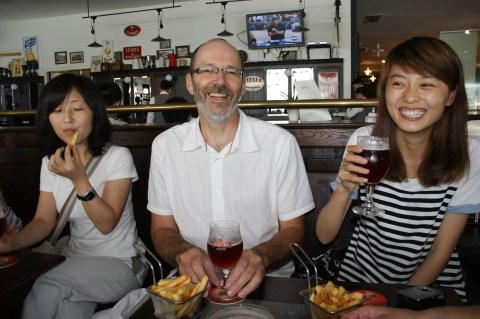 En onze Jos Gielen leert hen ook frieten eten en Kriek Belle Vue degusteren. Foto Olivia Snykers.
