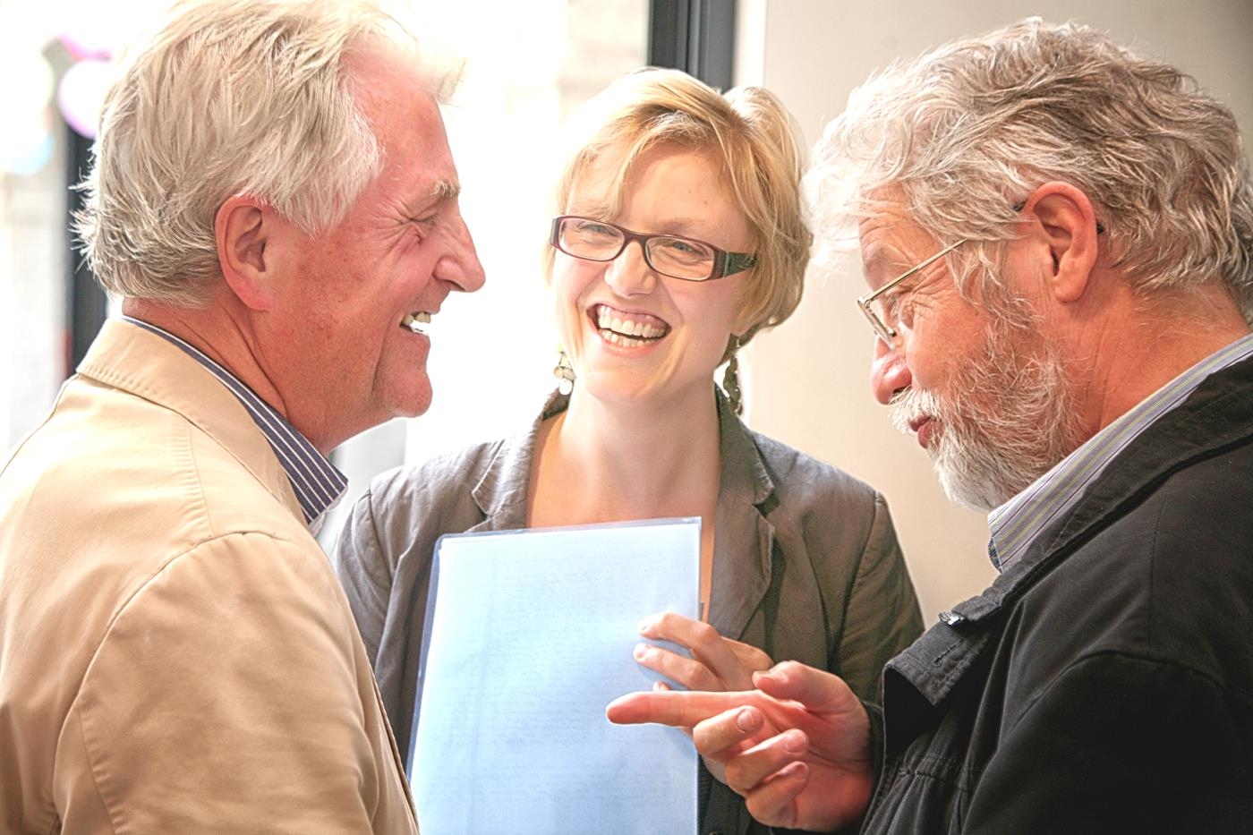 Samen met collega arts en grijze (post-)mei-68’er Pierre Chevalier bij de opening van het nieuwe centrum van Médecine pour le Peuple in Marcinelle waar onze dochter Sofie (midden) al 13 jaar werkt. (Juni 2012)