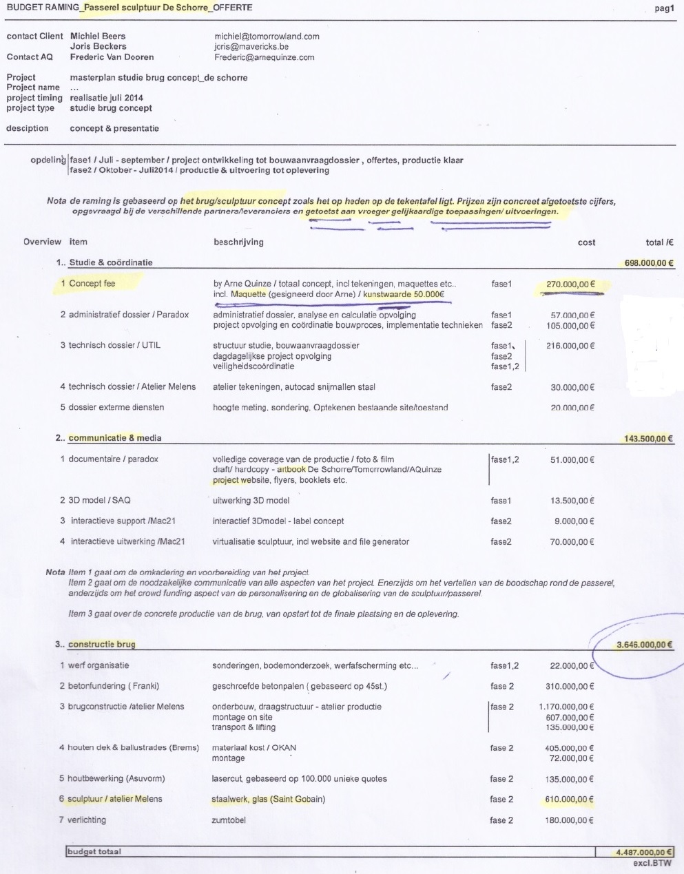 Met zijn eerste offerte (‘ Bruto Raming Passerel sculptuur De Schorre – Analyse’) kwam Arne Quinze aan een kostprijs van… 9,4 miljoen euro, duidelijk boven de EU-grens van 5 miljoen, waar men tot openbare aanbesteding moet overgaan. Die kostprijs bestond uit 1,2 miljoen voor studie en coördinatie (inclusief ‘intellectual property’ voor de kunstenaar), 300.000 euro voor ‘communicatie en media (uitgave van een kunstboek, een website en wereldwijde promotie van een documentaire over het kunstwerk) en bijna 8 miljoen voor de constructie van de brug zelf (waarvan 4,5 miljoen voor de eigenlijke brugconstructie zonder de kunstelementen). Zie de fac-simile 1 hieronder, u kan die vergroten door er op te dubbelklikken en na bezichtiging met back-pijl terug te keren naar het artikel)