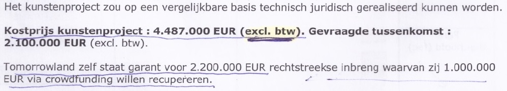 TML en Arne Quinze mogen dan wel al aan de brug begonnen zijn vóór de subsidie officieel werd goedgekeurd, ze deden wel het nodige om ze in de wacht te slepen. En de N-VA die wil bewijzen dat zij ook wat over heeft voor de kunstwereld – of althans de commerciële toppers ervan – kende ze gewillig toe. TML en AQ incasseren maar wat graag. Nochtans had Arne Quinze in Reyers Laat over de constructie van de brug gezegd: ‘De gebroeders Beers (eigenaren van Tomorrowland, km) vonden het tijd om iets terug te doen voor de maatschappij’. Hallo? Twee miljoen binnenrijven via de provincie en ook nog eens 1 miljoen via zogenaamde ‘crowdfunding’: is dat iets ‘teruggeven’? Of nog meer vragen aan de maatschappij?