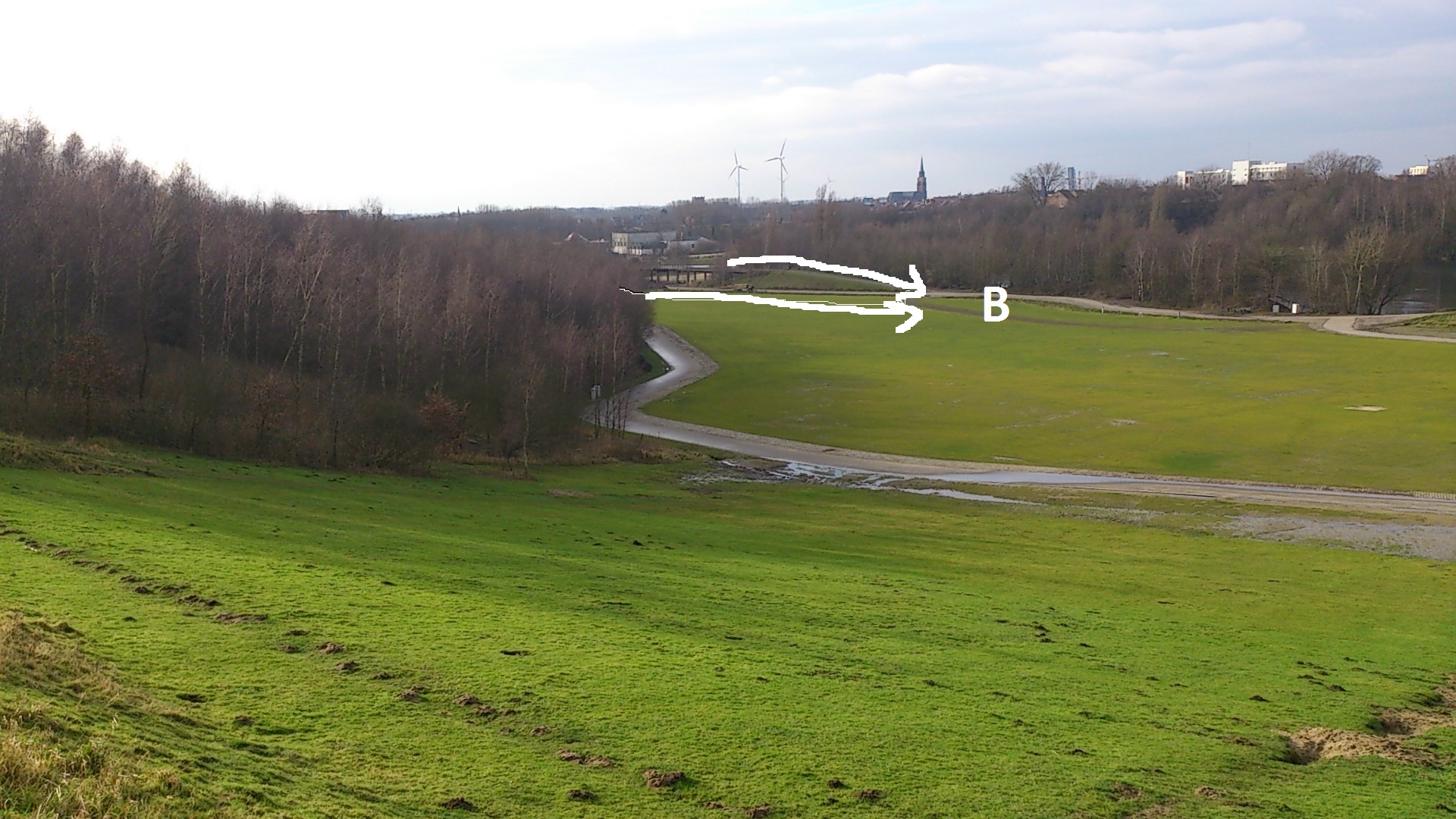 Het noordelijke einde van de brug loopt actueel gewoon uit op een kleine talud die je terug op de begane grond brengt aan de ingang van de Deltaweide (punt B).
