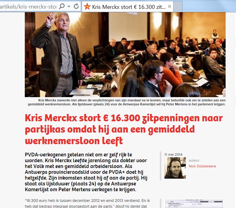 Deze bepaling in de statuten van onze partij, over de financiële voordelen die voortvloeien uit een mandaat als verkozene, kreeg door de verkiezingscampagne vorig jaar meer aandacht. De PVDA herbevestigde toen dat, als zij parlementaire verkozenen zou behalen, deze blijven leven aan een gemiddeld werkersinkomen. Om te illustreren dat dit geen loze beloften waren interviewde de redactie van de pvda-website mij over de 16.000 euro die ik in 2013 aan de partijkas had gestort. Men nam mij als voorbeeld omdat ik tot dan toe de verkozene was die het meest verdiende met zijn mandaat. Nu we twee Kamerleden hebben, twee verkozenen in het Waals parlement en vier in het Brussels Hoofdstedelijk Parlement zal dat natuurlijk veranderen. Hoe dan ook het is dus dit artikel (zie foto hierboven, km) dat de aandacht trok van mensen uit andere partijen op mijn verdiensten.
