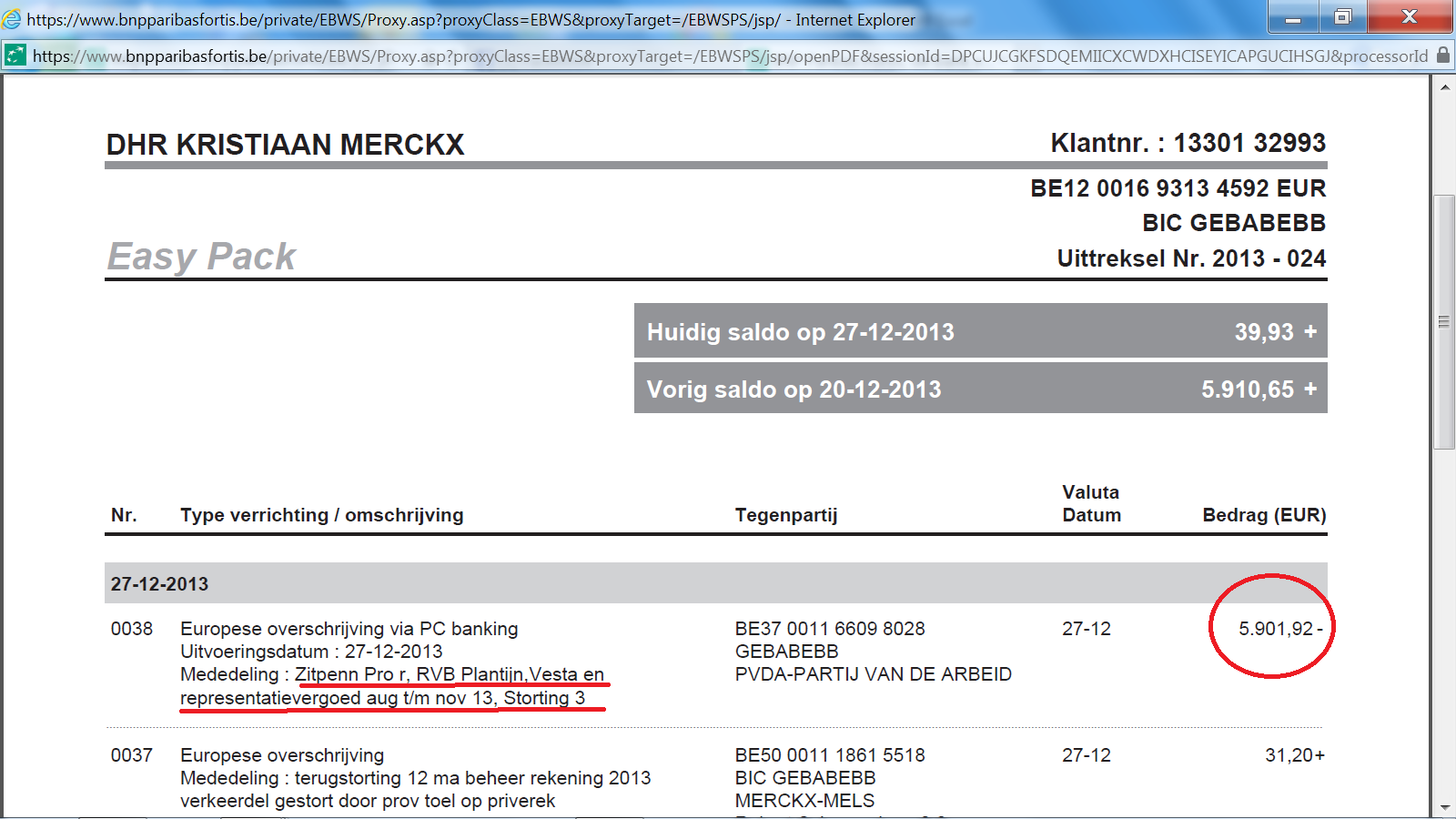 … maar het is vooral de afdracht van dat geld aan de partijkas (een van de stortingen hier in fac-simile) die steekt en de meerderheidspartijen aanzette om daar wat van af te pitsen.