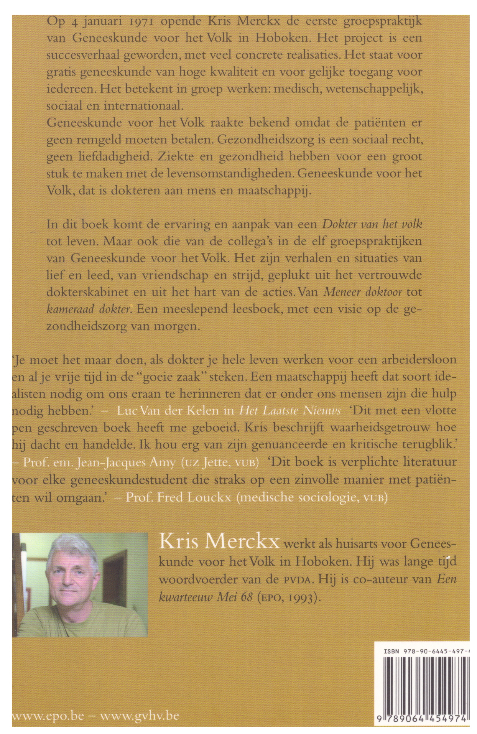 Je kan het integrale boek (422 bladzijden) in pdf-formaat lezen en raadplegen door te klikken op de link ‘dokter-van-het-volk-definitief’. Die vind je onder deze foto van de achterflap die een korte samenvatting geeft van de inhoud en ook quotes van prof. em. Jean-Jacques Amy (UZ Jette, VUB), prof. Fred Louckx (medische sociologie, VUB) en Luc Van der Kelen (ex-editorialist Het Laatste Nieuws).