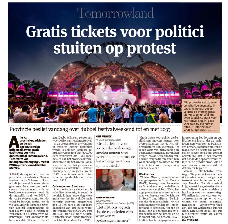 Gratis tickets voor politici die beslissingen moeten nemen over overeenkomsten met de festivalorganisatoren vormen de facto een vorm van beïnvloeding en belangenvermenging of wekken op zijn minst het vermoeden daarvan. Ze zijn ontoelaatbaar en, op een ogenblik dat de graaicultuur in de politiek in het vizier ligt, zijn ze extra ongepast. En geef toe: de vergoedingen die wij als provincieraadsleden voor ons werk ontvangen zijn een meer dan behoorlijke bijverdienste die ons toelaat zelf de tickets voor onze ontspanning te betalen.