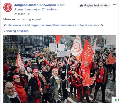 Tom Meeuws op de betoging van 24 maart. Boven deze foto op zijn FB-pagina staat de link naar de affiche en het platform dat de afschaffing van het hoofddoekenverbod eist op de werkvloer en in het onderwijs. Een maand later stemt de voltallige sp.a-fractie in de provincieraad… voor het behoud van dit verbod.