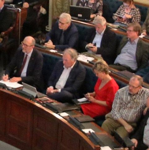 Inga Verhaert (in rood), gedeputeerde onderwijs, stak een een-tweetje in mekaar met eerste gedeputeerde Luk Lemmens van N-VA (eerste van links… op de foto) om niet te antwoorden op mijn interpellatie. Omwille van de gedepetudeerdenposten van Verhaert en Rik Röttger (achter haar) is sp.a al zes jaar lang de (welwillende) gegijzelde van de conservatief-rechtse N-VA.