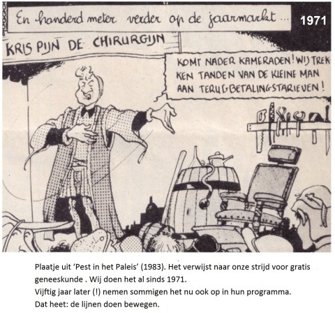Dit plaatje komt uit de populaire HUMO-strip ‘Pest in het paleis’ (1983). Die strip projecteerde toestanden uit de Belgische politiek van de jaren ’70-’80 op hilarische wijze naar… de Middeleeuwen. Auteur Guido Van Meir en tekenaar Jan Bosschaert bedeelden mij in dit verhaal de rol toe van ‘Kris Pijn de chirurgijn die gratis de tanden van de kleine man trekt’. Het plaatje verwijst naar de beroering die we veroorzaakten toen we in 1971 startten met de gratis ‘Geneeskunde voor het volk’ (GVHV).